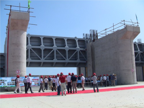 2010年7月28日,水利部淮河水利委员会在连云港市主持召开了新沭河治理工程三洋港枢纽挡潮闸工程水下工程(土建部分)验收会议。我公司作为项目混凝土技术单位的咨询单位参加会议。 三洋港挡潮闸位于江苏省连云港市郊临洪口,是经国家批准,由中央和江苏省人民政府共同投资建设的大型工程,为Ⅰ等大(1)型工程,主要建筑物为1级。挡潮闸闸室每孔净宽15m,共33孔,总净宽495m,总宽576.92m,闸底板顶高程-2.0m,闸室采用钢筋混凝土开敞式结构;闸墩顶高程7.00m,中墩厚2.2m,缝墩及边墩厚1.45m;岸墙采用钢筋混凝土空箱结构,灌注桩基础;排水闸布置在挡潮闸与泓道之间,共3孔,单孔净宽6.00m,闸底板顶高程-2.0m,采用钢筋混凝土涵洞式结构。 该工程为近海工程,需重点解决盐害(主要为氯盐和硫酸盐)侵蚀和大体积混凝土抗裂等问题。我公司承担了该工程的高性能混凝土配合比设计及其耐久性关键技术控制研究,在闸底板、闸墩等重要部位主要采用了大掺量磨细矿渣、聚丙烯纤维等技术措施来解决混凝土耐久性问题。挡潮闸工程于2009年8月中旬开工,至2010年7月中旬,完成主体土建工程的建设任务,提前完成了建设目标,实现了总体部署。累计完成混凝土浇筑15万立方米,高峰期月混凝土浇筑量达3万立方米,创江苏水利建设之最,工程施工质量已经江苏省质量监督中心站评定,质量优良。 本次验收会议中,与会领导和专家充分肯定了工程建设取得的成绩。